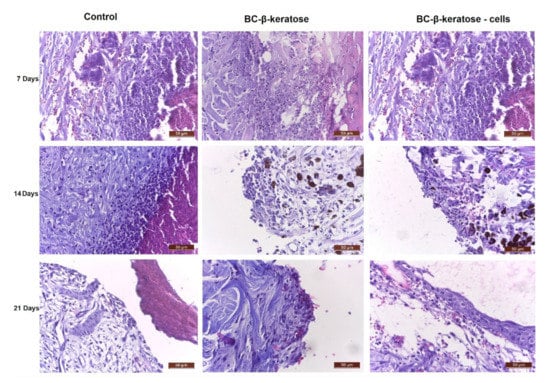 At 14 days after grafting, the sections from control group revealed an inflammatory process which slightly decreases in intensity. The influx of leukocytes was maintained. A discreet fibroblasts differentiation, connective fibers and blood vessels neogenesis were observed in hypoderm. Animals tissues grafted with BC-β-keratose developed an inflammatory process with lower intensity. The healing process is represented by important connective hyperplasia and neogenesis of blood vessels, with the formation of prominent vascular-conjunctive buds. At lot BC-β-keratose with cells, the inflammatory process is discreet; the regeneration is markedly, represented by vascular, connective buds, and fibroblast proliferation. Connective fibers and capillary neogenesis are important.