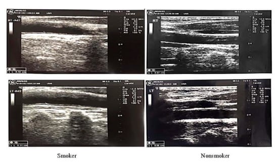 - Babiker, M.S. The Effects of Smoking on Carotid Artery Hemodynamics. J. Diagn. Med. Sonogr. 2016, 32, 149–152. [Google Scholar] [CrossRef]