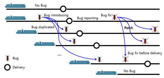 Figure 1 illustrates an example of how to induce a bug and duplicate it to multiple ships and removals during the manufacturing and operation of ships in series. The maritime and ocean industry is a conventional made-to-order industry that builds and delivers ships and offshore infrastructure that customers want. The fact that ships are mainly planned and constructed in sequence indicates that those same sister ships are virtually identical. Although ships do not have a prototype, the system, including the software, is tested during production to ensure that the predefined functions are working correctly [14]. As a result, various software installed onboard the ships shall be able to adapt or update functions promptly in advance or upon urgent adjustment requirements. Although most of the defects are avoided and prevented during testing, the characteristics of the maritime domain make it possible that defects will be induced into a whole series of ships until the bug is revealed and fixed if they are not found during testing. While defects detection is aimed in the test process to improve software quality and reduce cost, some defects are exploited in the operating phase. It can be very costly to patch such late-detected defects.