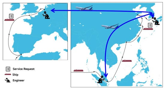 Once a ship is constructed and delivered to the ship owner, the ship will carry passengers and/or cargo while navigating designated or irregular routes. Ships travel around the world according to the route they operate. In the general IT environment, distribution or update of software through the internet or an automated distribution system are very common activities during deployment. However, in the maritime domain, an engineer would get to work on a ship at least once. If defects occur, the activity and visit of the engineer to the ship increases accordingly, raising the costs of installation and maintenance. The complexity of the service engineer’s job encompasses not just the time spent working on software, but also the time spent entering and leaving the shipyard and getting on the ship, and the unavoidable time spent. In addition, in order for a service engineer to visit the ship after the delivery, he/she must monitor the arrival and departure schedule of the ship, while taking into account the cost of overseas travel, ways to access to the port and to get on a ship, and unexpected changes of the schedule of the ship; it is common to wait one or two days or go to another port to get on a ship due to the delay in the schedule as depicted in Figure 2.