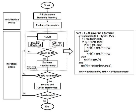The harmony search algorithm (HSA) is a population-based meta-heuristic optimization algorithm that imitates the music improvisation process where instrument players search the best harmony with repeated trails considering their experience [15]. Table 1 shows the parameters on which the HSA works. Harmony is a set of notes that each instrument player has decided. The harmony is stored in the harmony memory (HM) as an experience where each instrument player can refer to. A harmony memory size (HMS) indicates the maximum number of harmonies that instrument players can refer to. Whenever a new harmony is generated, each instrument player decides their own note considering a harmony memory considering rate (HMCR), a pitch adjusting rate (PAR), and a fret width (FW). HMCR is the probability that each player refers to a randomly selected harmony in the HM. PAR is the probability of adjusting a harmony that was picked from HM. FW is the bandwidth of the pitch adjustment. [25,26] The overall HS process iterates the maximum improvisation (MI) number of consecutive trails.
