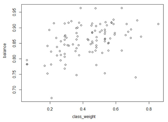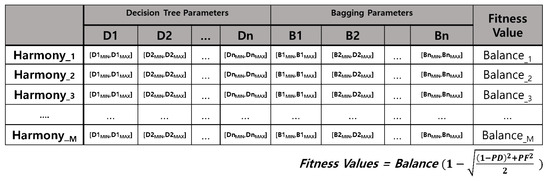 Harmony memory is composed of the number of harmonies (i.e., HMS), which is M in the Figure 6. Each harmony consists of the parameter values of variables and a fitness value presenting the harmony’s goodness. A harmony has 17 variables; 11 decision tree parameters and 6 bagging parameters, and each variable is between minimum and maximum, which each parameter can have. Each harmony’s fitness value is the balance of the prediction model, which is generated using the harmony.