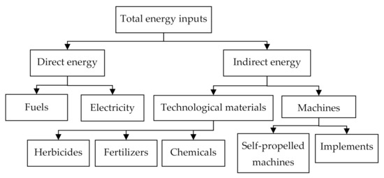 Energy requirements in agricultural production were divided into three groups: direct and indirect (two subgroups) (Figure 1). A direct energy flow included the energy of fuels and the electricity that are used by machines. An indirect energy flow consisted of two subgroups. The first was the energy used in the production processes of fertilizers, herbicides, and other chemicals. The second subgroup was the energy used in the manufacturing processes of farm machinery.