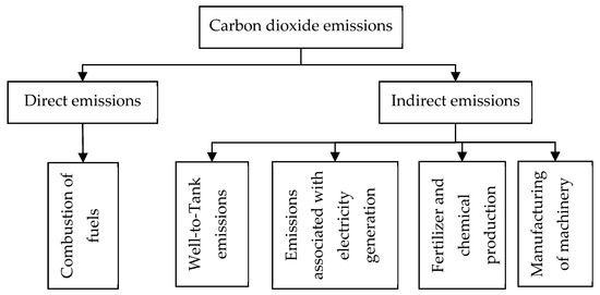 Carbon dioxide emissions occur due to the combustion of fuels, well-to-tank emissions (extraction of raw material, refinery, transportation, etc.), the emissions associated with electricity generation (from fuel production to electricity generation, distribution, and transportation), and the production of machinery, fertilizers, and chemicals (Figure 2).