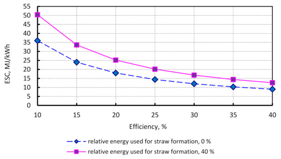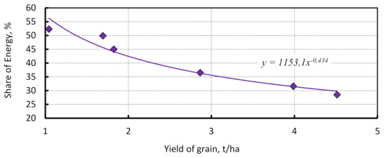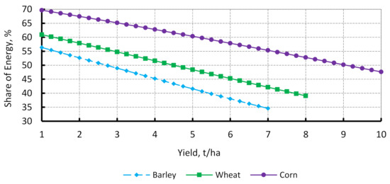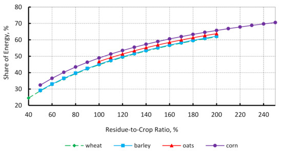 The impact of crop yield on the SR was studied using Equation (18). RCR functions for wheat, barley, and corn were taken from the results found by Bentsen et al. [70]. Our calculations showed that the share of energy used for straw formation has a significant dependence on the yield and type of crop (Figure 5). Corn has a higher value than other cereal crops.