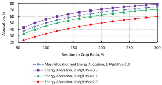 This expression resembles Equation (17), which is used to determine the energy allocation indicator. The only difference is that the energy allocation indicator takes into account lower heating values of grain and straw. Based on Figure 6, it is apparent that the mass allocation indicator can be considered as a special case of the energy allocation indicator.