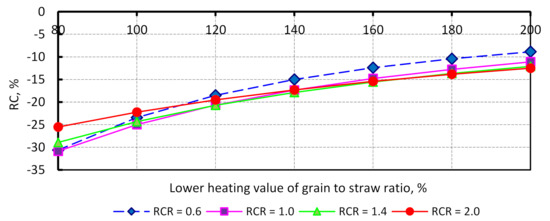 The results of our calculations are presented in Figure 7. The shape of the graph (Figure 7) depicts that the increase in the lower heating value of the grain-to-straw ratio results in a decrease in the rate of change of the energy allocation indicator.