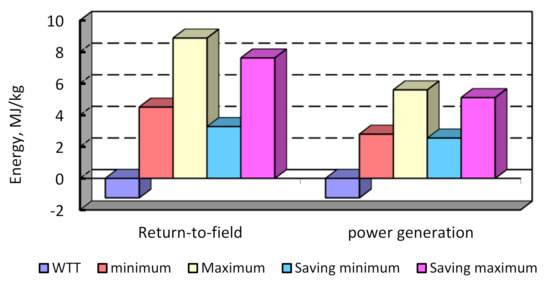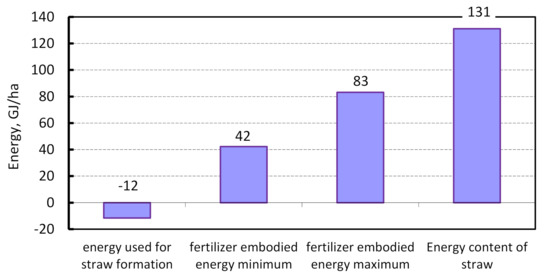 The energy consumption for straw formation and the energy consumption for straw collection were compared. Nguyen et al. [45] reported that the energy consumption for straw collection ranged from 0.37 to 0.588 MJ per kg of straw. Ou et al. [50] reported about 0.4256 MJ per kg of straw. However, if the energy consumption for straw formation is taken into account, the embodied energy ranges from 1.1 to 6.2 MJ/kg. Therefore, the energy consumption for straw formation may be up to 10-fold the energy consumption for straw collection, and it should be taken into account in an energy analysis of straw use.