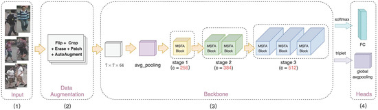 The architecture of Multi-Scale Focusing Attention Network (MSFANet), containing four steps: (1) Input of training images; (2) Data augmentation on training images; (3) The backbone of this model for extracting images’ feature, which is composed of three stages with 1, 2, and 3 MSFA Blocks; (4) Heads of MSFANet for training with softmax and triplet loss function, respectively.