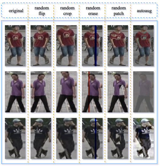 For ReID task, it is crucial to leverage data augmentation to help the model learn more discriminative features. Considering the person ReID task in the actual scene, there are many factors such as occlusion, viewpoint change, and background change, etc. Combining a mass of homologous experiments in this paper, we found that data augmentation is extremely beneficial to improve the model’s generalization capacity by performing random flipping, random cropping, random erasing, and random patching on varieties of ReID datasets. Specifically, as shown in Figure 2, the random flipping’s operation is randomly flipping the image in the horizontal direction. In addition, random cropping is a method of cutting edges randomly, helping to focus on the area of interest, which can be seen in column 2. Besides, the random erasing and patching are both used to imitate target occlusion in the actual scene. Furthermore, we also add autoaugment [29], applying reinforcement learning, to learn data augmentation rules from datasets, which can be very convenient to transfer to new datasets. The following experimental results verify that together these data augmentations can achieve comprehensive performance improvement based on MFSFANet.
