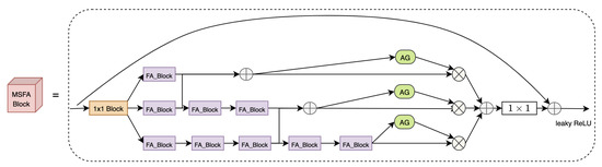 where l indicates at which stage and denotes one stage’s aggregation features of multi-branch FA layer that learn multi-scale fusion features, and can be obtained by Equation (2), is