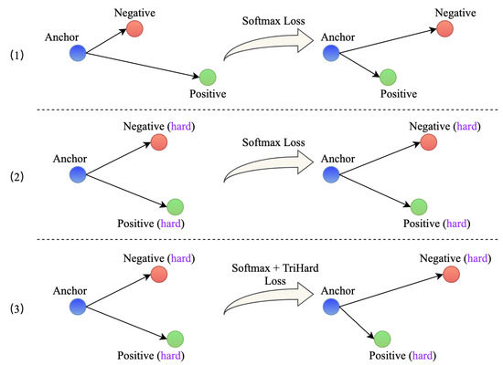 Fusion Loss. Softmax loss and TriHard loss both have their respective advantages in ReID model’s training. However, there are some problems when we use softmax loss alone. As presented in the top part (1) and middle part (2) of Figure 5, we can observe that the softmax loss can distinguish positive and negative sample well to some extent, but is hard to deal with some hard samples. TriHard loss can achieve batch hard sample mining during model training. It can shorten the distance from hard positive samples while maximizing the distance of hard negative pairs [30]. In this work, we combine the two loss functions to improve the generalization of MSFANet, which can alleviate the hard sample differentiation problem shown in bottom part (3) of Figure 5. The fusion loss can be viewed as Equation (6), where and are hyperparameters that can adjust the above two loss functions’ weight. In our abundant experiments in different ReID datasets, we found that MSFANet can achieve the best robustness and fastest convergence when and are set 1 and 0.5, respectively. Thus, our subsequent experiments are all based on this parameter setting.