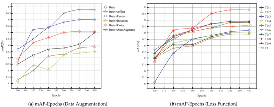 mAP (%) under epochs based on different data augmentation combinations (a). mAP (%) under epochs based on fusion loss function with different coefficients (b), where T denotes the result of the fusion loss function with weight .