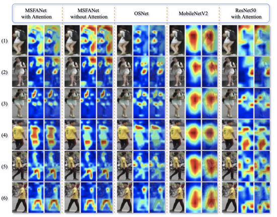Results on Feature learning of MSFANet. We conduct a set of feature map visualizations on the final output feature maps of MSFANet with attention, MSFANet without attention, OSNet, MobileNet v2, and ResNet50 with attention, as shown in Figure 7. We notice that MSFANet without attention has no apparent attention to region features, while MSFANet with attention can better focus on the regional features, as shown in the 1st and 2nd columns of the following figure. However, the attention regions can sometimes overly emphasize some local areas (e.g., clothes), implying the risk of overfitting person-irrelevant nuisances. In contrast, the attention of MSFANet can strike a better balance: it focuses on more of the local parts of the person’s body while still being able to eliminate the person from backgrounds. Compared with other models, such as OSNet, MobileNet v2, and ResNet50, MSFANet’s multi-scale attention has a more preeminent ability in extracting discriminative ReID features from the row images. MobileNetV2 and ResNet50 are more about capturing global features and ignoring significant local features. The results show that MSFANet performs state-of-the-art.