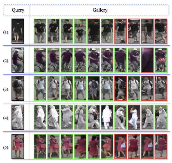 The inference results of MSFANet. For each query, the top ten searching results from the gallery are shown. The green box indicates the correct match, while the red box is the opposite. (1)–(5) show the query results for the different test samples.