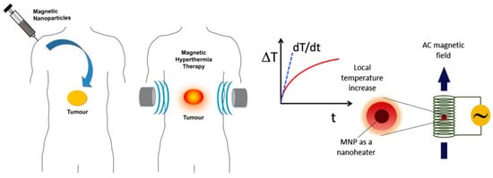 The recent run of industrial development, in particular nanotechnology, has opened-up new possibilities for medical science, especially in the field of magnetic hyperthermia. New superparamagnetic nanoparticle systems of varying nanoscales have been developed and integrated into magnetic hyperthermia (Figure 1) [,,]. The number of patents and products in the field of magnetic hyperthermia is also growing rapidly. A wide range of magnetic hyperthermia technologies are being developed or are already being studied in the clinical stage to provide more effective and safer treatments for clinical applications [,,,,,]. In the field of cancer treatment, one of the fields where magnetic nanotechnologies are most needed, many new superparamagnetic nanoparticles were recently developed, to name a few, Mg0.13Fe2O3 and FASP-Fe3O4, etc. [,,,,,].