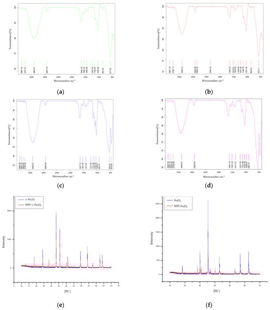 Characterization of WPI−SNPs: (a) FTIR spectra result of the original γ−Fe2O3; (b) FTIR spectra result of the modified WPI−γ−Fe2O3; (c) FTIR spectra result of the original Fe3O4; (d) FTIR spectra result of the modified WPI−Fe3O4; (e) XRD comparison result of γ−Fe2O3 and WPI−γ−Fe2O3; (f) XRD comparison result of Fe3O4 and WPI−Fe3O4.