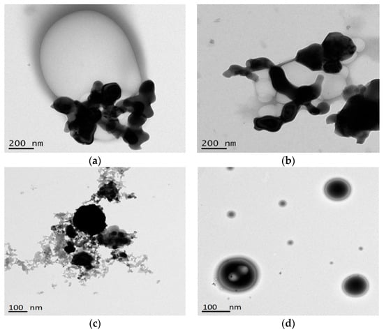 TEM image of (a) γ−Fe2O3; (b) WPI−γ−Fe2O3; (c) Fe3O4; (d) WPI−Fe3O4.