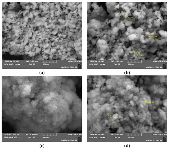 SEM image of (a) γ−Fe2O3; (b) WPI−γ−Fe2O3; (c) Fe3O4; (d) WPI−Fe3O4.