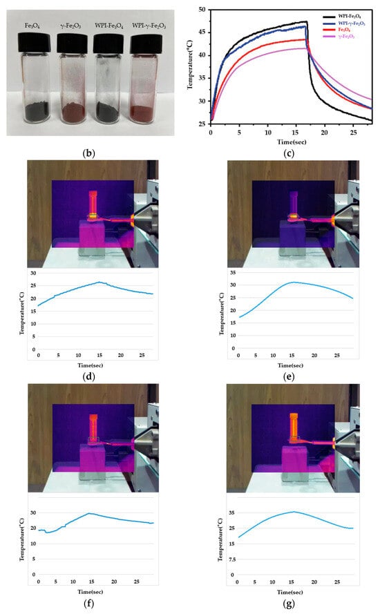 After a number of experiments on concentrations of WPI-nanoparticles, which contained γ-Fe2O3 and Fe3O4 ranged from 50 wt.% to 90 wt.%, under normal power dissipation conditions (3 KW), frequency (100 kHz), and rated time (15 s), we found optimal conditions that WPI-γ-Fe2O3 with γ-Fe2O3 (67 wt.%) and WPI-Fe3O4 with Fe3O4 (85 wt.%) are shown in Figure 5d–g. WPI-γ-Fe2O3(67wt%) can be an easier control of temperature, continuously heated, and slower temperature drop. WPI-Fe3O4(85wt%) can be rapid heating to target temperature in a short time, good thermal destructive power, and faster temperature drop. Based on the above results, two different types of modified superparamagnetic nanoparticles can be selected for different tumor types or different treatment options.
