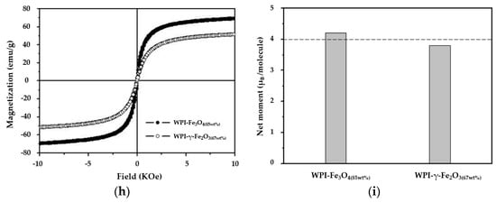 Figure 5h shows Ms value of WPI-γ-Fe2O3(67wt%) and WPI-Fe3O4(85wt%) is 51 (emu/g) and 69 (emu/g). The net magnetic moment, which can be expressed alternatively in terms of μB (Bohr Magnetron) as calculated by the distribution obtained experimentally using Mössbauer spectroscopy, indicated that 3.7 (WPI-γ-Fe2O3(67wt%)) and 4.2 (WPI-Fe3O4(85wt%)) were clearly seen shown in Figure 5i.