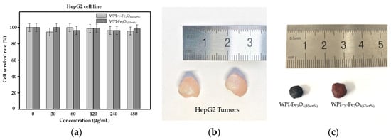 In vitro release of WPI-SNPs: (a) cells survival rate results of WPI-γ-Fe2O3(67wt%) and WPI-Fe3O4(85wt%) with HepG2 cell line; (b) HepG2 tumors were taken from mice for in vitro experiments; (c) HepG2 tumor after in vitro magnetic hyperthermia with WPI-γ-Fe2O3(67wt%) and WPI-Fe3O4(85wt%).