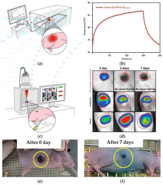 (a) Model of in vivo magnetic hyperthermia with mice carrying HepG2 tumors; (b) results of tumor temperature during in vivo magnetic hyperthermia; (c) model of high-energy thermal inductance (HETI) equipment for check result of tumor scale after in vivo magnetic hyperthermia; (d) set result of tumor scale: the first row using in vivo magnetic hyperthermia with WPI-Fe2O3(85wt%). The middle row using treatment with Adriamycin. The bottom row using treatment with normal saline; (e) the survival curve of mice at 0 day after magnetic hyperthermia; (f) the survival curve of mice at 7 days after magnetic hyperthermia.