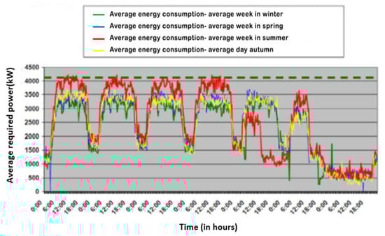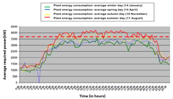 Figure 2, where the electricity consumption profile for different times of the year is observed. Within the electrical energy consumption of the factory, the refrigeration systems account for a percentage of 44.1% of the total (