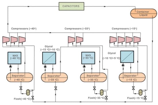 Figure 4). Line N°1 at −40 °C of evaporation is associated with the freezing tunnels, line N°2 at −33 °C of evaporation is for the meat treatment processes and freezing chambers, and Line N°3 at −15 °C of evaporation is for chambers and the heated meat processing areas (
