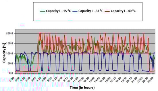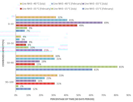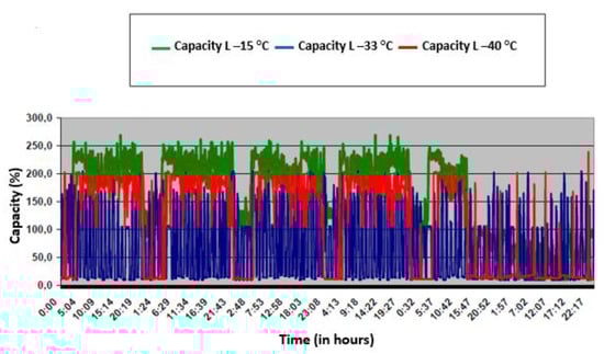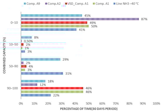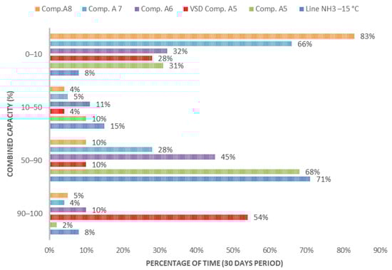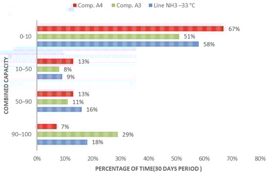 Figure 7 obtained from the operation measurements of the factory facilities control system help to visualize the operation mode and the average capacity level of the facility. With the capacity analysis, it was possible to measure the percentage of time (in a period of 30 days) for a certain level of capacity for each of the three refrigeration circuits (