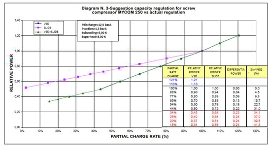 Figure 12, throughout the regulation range (100% to 44%), limits imposed by the working conditions of the motor/compressor (lubrication and ventilation) established by the manufacturer regarding the spin speed (2950 rpm to 1475 rpm), savings of up to 31% can be achieved. It is also worth noting that for the upper regulation range (100% to 80%), the capacity control by means of the slide acts in a similar way to the speed variation conditions, with the consequent reduction in energy saving opportunities.