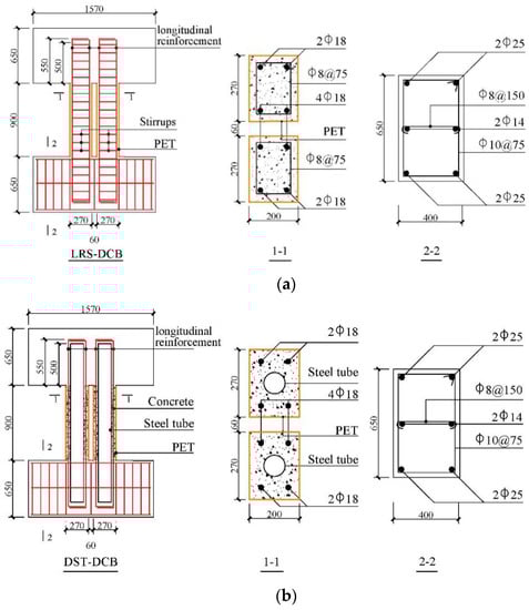 As just mentioned, the application of an FRP-concrete-steel DST composite member is mainly concentrated in the RC column and beam. For this type of coupling beam with a small span-height RC member, the corresponding research is rarely reported. Based on the excellent performance of the DST system on the flexural behavior of composite beams and the great ductility performance of DST composite columns, the authors applied LRS-FRP to the DST double coupling beam to form an LRS-FRP-concrete-steel DST composite coupling beam. In which, the double coupling beam not only facilitates the arrangement of pipeline lines but also significantly reduces the internal force of the coupling beam and improves the seismic performance of the coupling beam. However, it has an unavoidable disadvantage of rapid degradation of stiffness and bearing capacity at a later stage []. This paper features the authors’ quasi-static low-cycle reversed loading experimental program carried out to research the bearing capacity, ductility, and energy dissipation of LRS-FRP-concrete-steel DST double coupling beams.