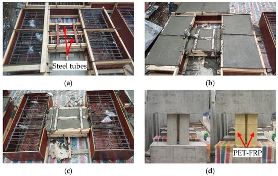 Specimen manufacture: (a) steel tubes and formwork; (b) integral cast in place; (c) prefabrication of coupling beam; (d) polyethylene terephthalate fiber-reinforced polymer (PET-FRP) strengthening.