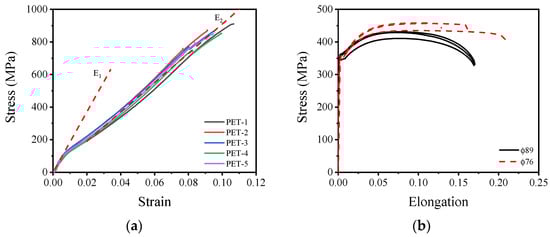 Tensile stress-strain curve of materials: (a) PET sheet; (b) steel tubes.