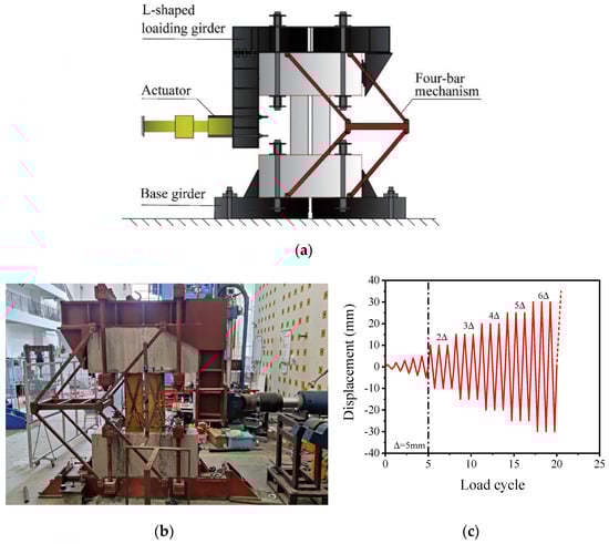 Figure 4 illustrates the test setup for the quasi-static low-cycle reversed loading experiment. To make sure the loading scheme replicates the real situation of the coupling beam, as shown in Figure 4a,b, the equipment consists of four parts that were designed, fabricated, and applied in the test. Notably, the coupling beam was rotated 90° and erected along the longitudinal axis of the specimen. From this point, the coupling beam was connected with the bottom foundation and top L-shaped loading girder through a four-bar mechanism. The top L-shaped girder transmitted the load from the 500 kN hydraulic servo-system to the coupling beam. In addition, the four-bar mechanism can ensure that the horizontal force applied in the loading process is always in the loading plane and remains horizontal. Meanwhile, the four-bar mechanism can prevent torsion from occurring in the top steel beam due to the failure of the ends of the coupling beam under large deformation.