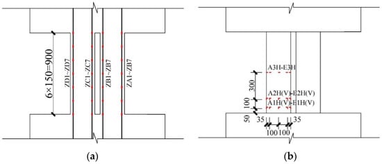 Strain gauges 5 mm in length were used to measure the strains of steel bars and PET sheet. Figure 5 illustrates the strain gauge locations. Figure 6 shows the horizontal deformation of the composite system, which was recorded by two linear variable differential transformer displacement sensors (LVDT, LVDT-1, and LVDT-2 in Figure 6a). The longitudinal deformation was recorded by LVDT-3. The shear deformation of the coupling beam, as illustrated in Figure 6b, was obtained by transforming the test data from LVDT4–7 (as illustrated in Figure 6a) by calculating Equation. (1).