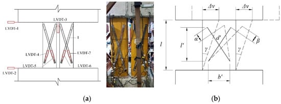 where Δv and l are the shear deformation and initial length of the coupling beam, respectively; γ is the deflection angle between the initial and real-time state of the coupling beam, which can be calculated as γ = d′(α + β)/(2l′b′). As illustrated in Figure 6, d′ is the initial length of LVDT, while l′ and b′ are the initial projection lengths of the LVDTs in the corresponding direction. Finally, α and β are the length change of two LVDTs.
