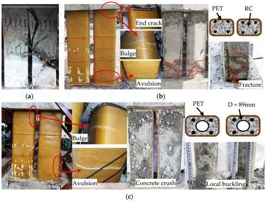 After artificially removing the PET-FRP jacket and concrete, the specimens LRS-DCB and DST-CB-89 presented two different failure modes in Figure 7. In Figure 7b, many cracks are shown as generated at the plastic hinge areas at both ends of the specimen LRS-DCB. Furthermore, one main crack appeared at the junction of the beam and on the end block. Figure 7c shows serious concrete crushing and local buckling of the steel tube occurring in those specimens with inner steel tubes. The primary analysis concluded that the local buckling of the inner tube invalidated any blame on the constraining effect to concrete provided by the PET-FRP material; then, concrete started crushing as the deformation increased. When the crushed concrete filled the gap and the deformation increased, the constraining effect of the PET-FRP sheet controlled the attenuation of the bearing capacity.