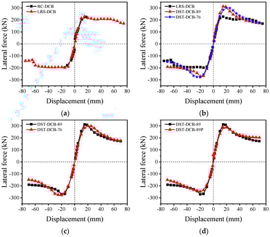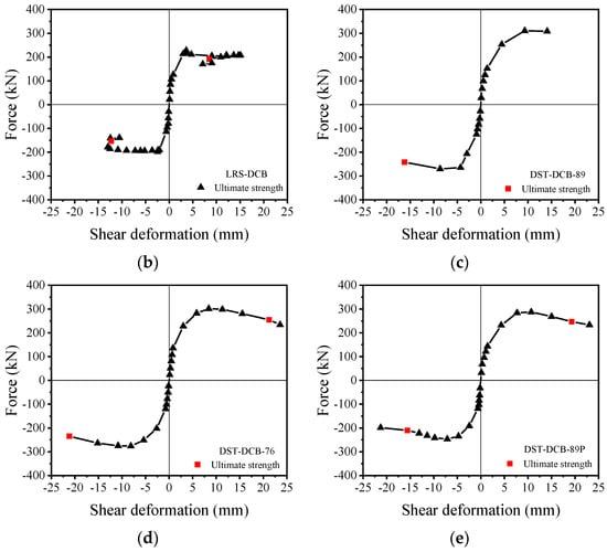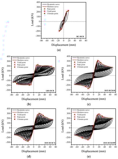 Hysteretic curves of all specimens: (a) RC-DCB; (b) LRS-DCB; (c) DST-DCB-89; (d) DST-DCB-76; (e) DST-DCB-89P.