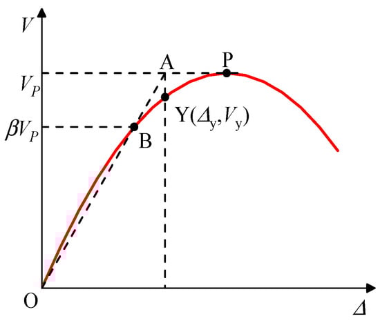 Since there is no obvious yielding point in the envelope curves of all specimens, the yielding point of these members is determined by the method reported by Park []. As illustrated in Figure 9, which shows the point set corresponding to the 75% peak strength at point B. Then, point A is the intersection of the OB extension line and the horizontal line corresponding to the peak strength. Finally, we can define the interaction of the load-displacement curve and the perpendicular line passing through point A near the displacement axial as the yielding point (point Y in Figure 9). The calculated yield strength and corresponding deformation of the specimens are listed in Table 4.