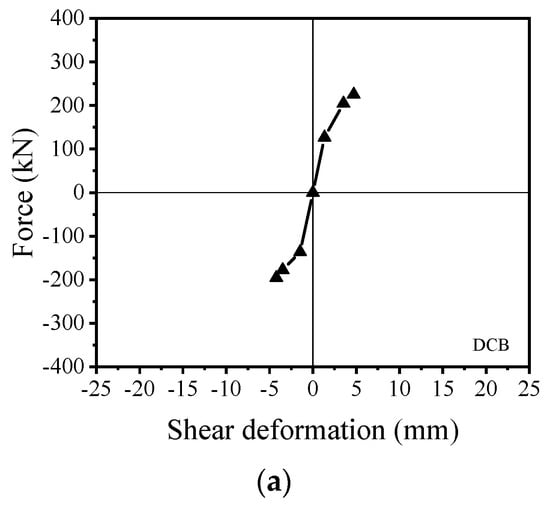 For the control specimen RC-DCB, as shown in Figure 8a, the force increases elastically before a crack generates. With the deformation increase, the cumulative damage expands and the stiffness degrades gradually. The specimen reaches the yielding stage when the longitudinal reinforcement yields. Then the load bearing capacity of the specimen can hardly be further improved. With the shear cracks generating and developing, the stiffness of the specimen is further reduced. Before the occurrence of shear failure, the load dropped suddenly, which also resulted in the ultimate lateral deformation being very small relative to the other strengthened specimens.