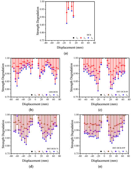 Strength degradation of all specimens: (a) DCB; (b) LRS-DCB; (c) DST-DCB-89; (d) DST-DCB-76; (e) DST-DCB-89P.