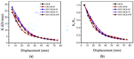 The normalized stiffness is the stiffness ratio between each main cycle Kj and the first cycle K1. The normalized stiffness of all specimens is illustrated in Figure 13. Compared to the control specimen RC-DCB, the stiffness of the other strengthened specimens dropped slightly slower in the initial stage due to the effect of the external wrapped PET-FRP sheet or the inner steel tube. Since the limited constraint effect is provided by the PET-FRP material, the normalized stiffness of the LRS-DCB specimen dropped faster than those with embedded steel tubes in the initial stage. With the deformation increase, the increasing confined stress limited the stiffness degradation, which caused the slope of the curves to flatten out. The initial stiffness of the DST-CB specimens was mainly controlled by the inner steel tube, which dropped at a slower rate than that of the LRS-DCB specimen. With the increase of deformation, the inner steel tube yielded, and the PET-FRP material constraint effect controlled the stiffness degradation of the specimens.