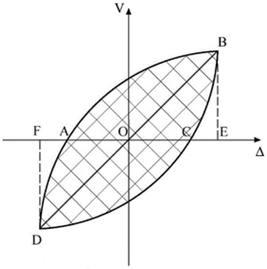 Energy dissipation performance reflects the energy consumption capacity of components under earthquake action. Usually, the fuller the hysteretic curve is, the stronger the energy dissipation performance, and the better the seismic performance. Under repeated loading, the member absorbs external energy during loading and releases energy during unloading. The subtraction of the energy during the cycle is defined as energy dissipation, as shown in Figure 14, which is equal to the area surrounded by the hysteresis loop. The equivalent viscous damping coefficient, ξeq calculate with Equation (4), and the cumulative energy dissipation, ΣS, can be used to evaluate the energy dissipation capacity of members in an earthquake.