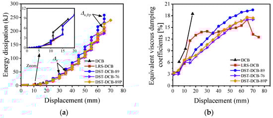 As shown in Figure 15a, the cumulative energy dissipation has shared similarities before yielding. The DCB specimen yields first resulting in cumulative energy dissipation, which increased faster than the others. The total cumulative energy dissipation of the LRS-DCB specimen and the DST-DCB coupling beams were improved significantly relative to the DCB control specimen. Compared to the control specimen, the cumulative energy dissipation of the LRS-DCB, DST-DCB-89, DST-DCB-76, and DST-DCB-89P specimens corresponding to Δu improved by 2019%, 376%, 496%, and 500%, respectively. Moreover, the cumulative energy dissipation of the LRS-DCB, DST-CB-89, DST-CB-76, and DST-CB-89P specimens corresponding to Δu,frp improved by 2352%, 2877%, 2345%, and 2660%, respectively, compared to the control specimen. This indicates that the energy dissipation performance of the coupling beam could be greatly improved by wrapping one PET-FRP sheet. The DST composite system also presents excellent energy dissipation. In addition, the results indicate that the tube’s diameter has a slight positive effect on the energy dissipation behavior of the coupling beam.