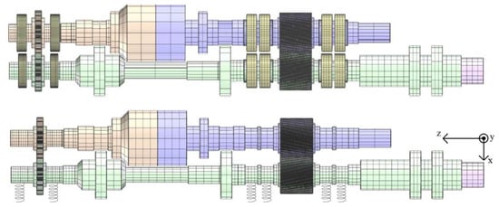 While this approach has already proven to be very computationally efficient, by substituting the bearings with equivalent springs, the stiffness of which was calculated with separate simulations, the computational effort could be further reduced, and plenty of simulations could be performed in a reasonable amount of time. In fact, in the past the authors have modeled the same configuration by means of traditional FE software. The time required for the solution of a single time step on 115GFLOPS hardware was about 30 h. With the present approach, the simulation of the same gearbox performed, in the same amount of time and on the same hardware, about 700 time-steps. The substitution of the bearings with equivalent springs (Figure 4) further doubled the number of time-steps that could be computed in the same amount of time.