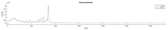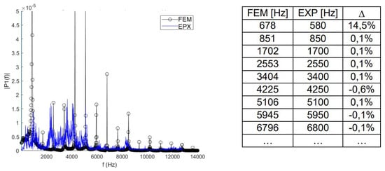 To validate the results of this hybrid approach, some experimental measurements were performed on the real back-to-back test rig. The two gear-meshing frequencies—850 Hz (meshing frequency of the test gears) and 1700 Hz (meshing frequency of the slave gears)—were clearly visible in the measurements (Figure 5). Other peaks corresponding to 2550 Hz, 3400 Hz, 4250 Hz etc. were the harmonics of the GMFs. The agreement between the predicted and measured frequencies was good; the amplitudes differed, but it must be considered that the damping factors introduced in the model were not calibrated—the goal was to predict the frequencies only.