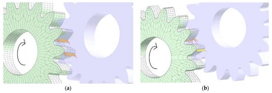 Pressure profile on the meshing gears of the testing gearbox: (a) nonpitted spur gears; (b) pitted (PitF) spur gears.