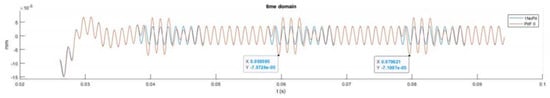 While the vibrational spectrum already had a characteristic frequency related to the GMF (which is also the main source of excitation), the presence of a pit on a single tooth promoted the excitation of an additional frequency (1/n), where n is the rotational speed (Figure 9). The vibrational spectra were obtained with a double derivative of the displacement data obtained from the simulations.