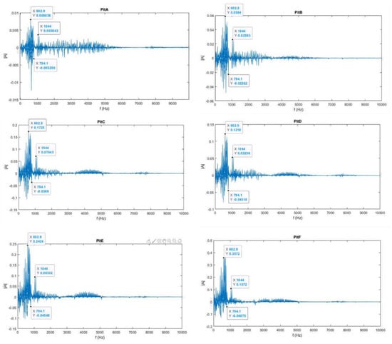 As Figure 9 and Figure 10 show, the spectra of the damaged conditions differed from the spectra of the healthy one, mainly in the excitation of new frequencies below the GMF. In order to better visualize this effect, Figure 11 shows the differential spectra of the damaged gearbox (damaged minus healthy) for different pitting severities (A to F). The increase of the vibration amplitude at certain frequencies with the increasing level of damage was evident.